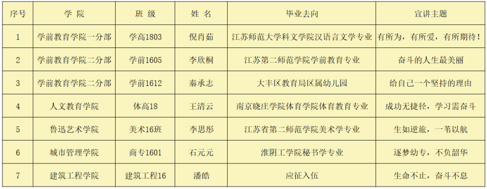 来自学前教育学院一分部的倪肖茹,用四个极具意义的日子讲述了自己起承转合的幼专三年时光,“在不断与世界的冲撞中,每个人都能够成为最优秀的自己”;来自学前教育学院二分部的李欣桐分享了学习生涯和赛事历程,她坚信只要满怀希望,便会所向披靡;秦承志同学总结了自己参加各类比赛的经验,“不要把对手想得过于强大,学会将自己的优点发挥到极致,相信自己一定行”;来自鲁迅艺术学院的李思彤祝愿各位学子,生如逆旅,一苇以航;来自人文教育学院的王清云分享了自己整理的教资和转本干货,“成功没有捷径,一步一脚印,坚持到底,成功一定属于你们”;来自城市管理学院的石元元讲述了自己备考专转本的心得体会,“乾坤未定,你我皆是黑马”;建筑工程学院的潘皓谈到他毕业后选择参军入伍,报效祖国的家国情怀,“到祖国最需要的地方,挥洒青春,是我们当代大学生义不容辞的责任与担当”。