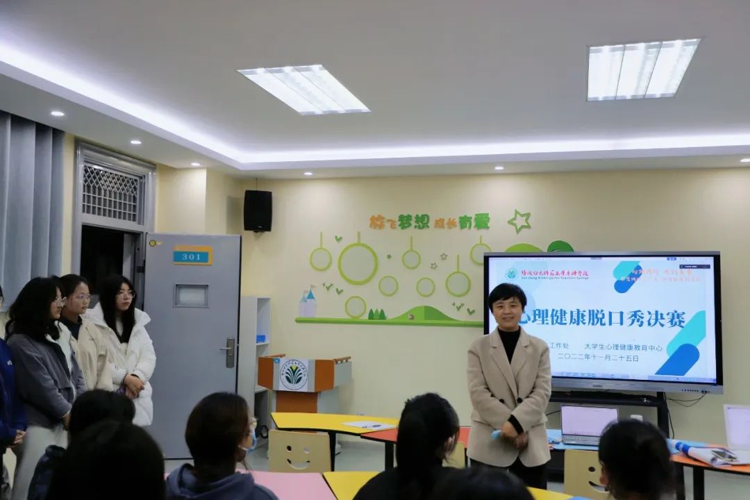 为学习贯彻党的二十大精神,培养大学生自尊自信、理性平和、积极向上的精气神,11月25日下午在我校海洋路校区大学生心理健康教育中心举办了首届心理健康脱口秀决赛,11个参赛组闪亮登场,心理健康中心老师曹静、校自律会主席张楷琦、副主席陶霜洁、心理调研部部长钱单静、学习部部长鞠梦露、督查部部长李韩轩担任评委,学工处处长张彬出席本次活动。