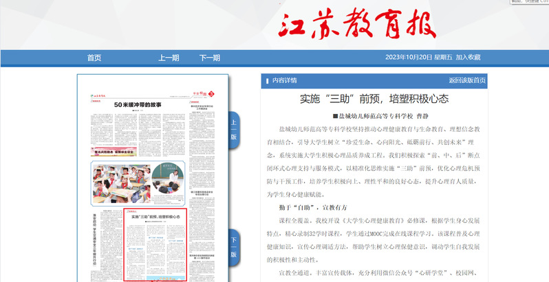 10月20日,《江苏教育报》刊登我校学生工作处曹静老师的署名文章《实施“三助”前预,培塑积极心态》,报道我校心理健康教育工作开展情况。